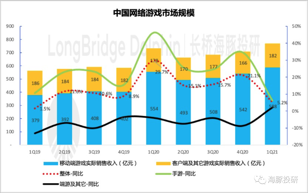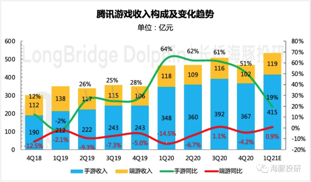手游方面,面对去年四季度发布的《原神》、《万国觉醒》等黑马崛起,虽然从前十大流水游戏榜单中,腾讯的市场份额似乎环比有所下滑,但同比依然实现了19%的增长,超出海豚预期的16%。而同期整体手游行业的增速仅6.25%。