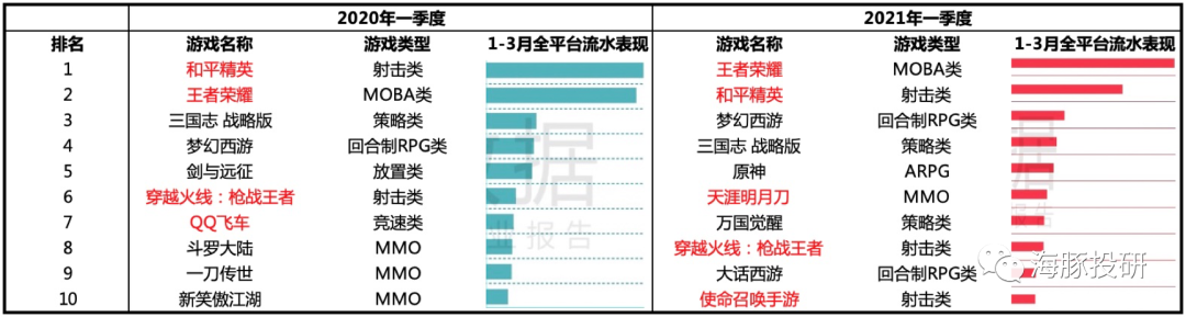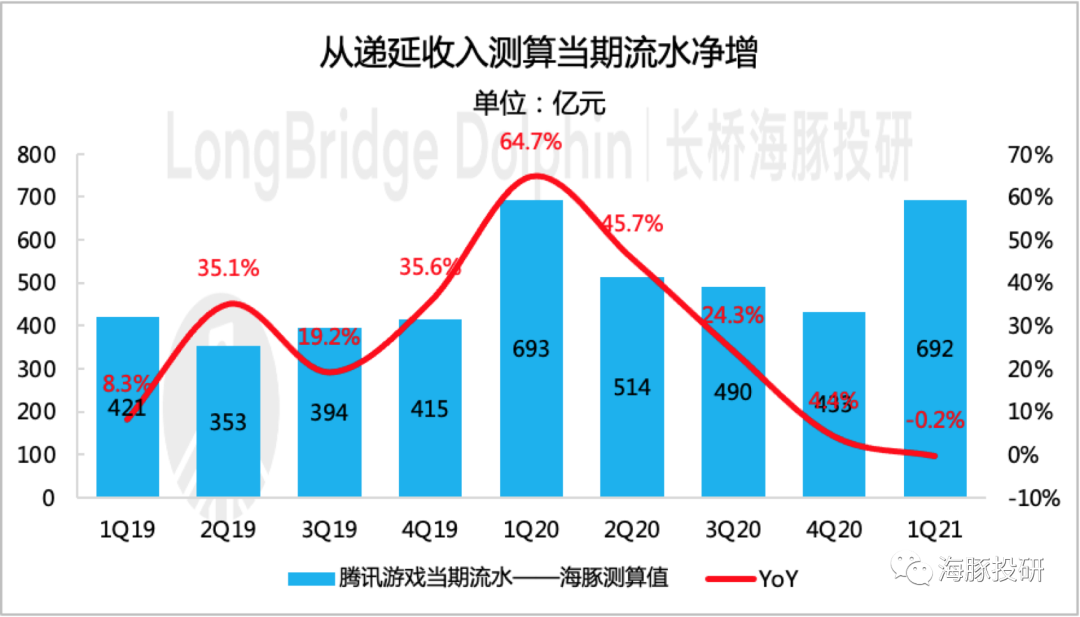 可以看出,一季度的整体游戏流水同比略有下滑,与海豚君此前【腾讯流水预测】文章中的判断基本相符。