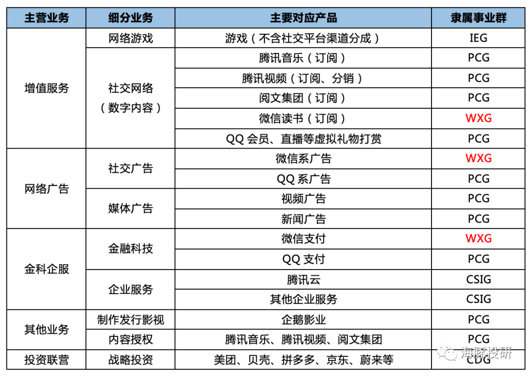 在《腾讯前瞻》中,海豚君梳理了腾讯在今年新一轮组织变革之后的业务框架与相应的事业群架构,可以帮助投资者更好的了解腾讯的商业版图。(这里仅贴上腾讯主营业务结构梳理)