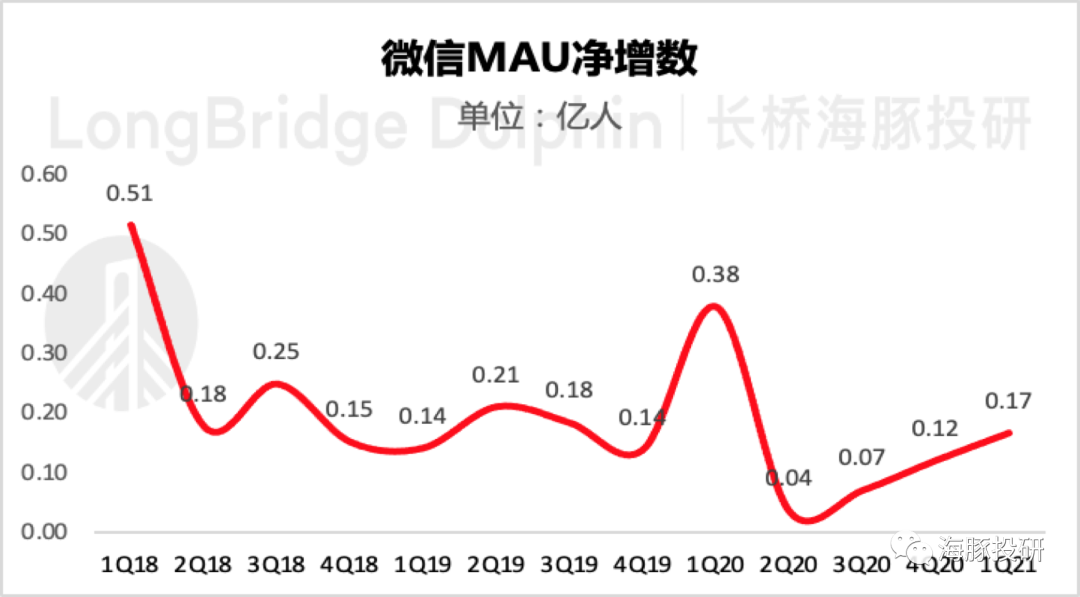 而年轻用户渗透率较高的QQ端,则在用户长大后转移微信而流失。虽然一季度因为春假因素而净增长1200万人,但与18、19年相比仍然在趋势性下滑。
