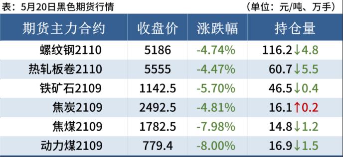 建筑钢材:5月20日,全国31个主要城市20mm三级抗震螺纹钢均价5435元/吨,较上个交易日下跌187元/吨。期螺大幅下挫,上午国内多数地区建筑钢材价格继续下跌,并且跌幅再次扩大。午后,随着期螺低位小幅反弹,部分跌幅较大地区价格开始低位小幅回涨。消息面上,Mysteel数据显示本周建筑钢材产量小幅下降,社会库存继续下降,但钢厂库存由降转增,库存去化有所放缓,建筑钢材表观消费量较上周亦有所下降。