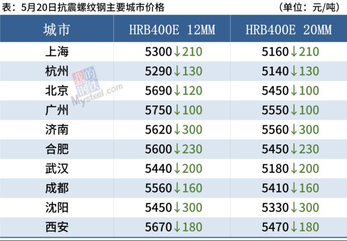 我的钢铁讯:5月20日,国内钢材市场大幅下跌,唐山迁安地区普方坯出厂资源含税下调150报5150元/吨。恐高情绪影响下,近日期现市场同步下跌,随着钢价合理回归,今日市场低价成交有所好转。
