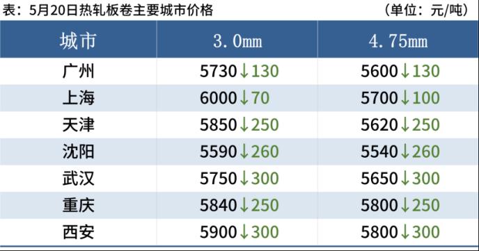 热轧板卷:5月20日,全国24个主要城市4.75mm热轧板卷均价5751元/吨,较上个交易日下跌310元/吨。现货市场早盘报价受19日夜盘影响报价大幅走弱,跌后市场成交一般,但是目前市场贸易商在经历了一轮千元幅度的暴涨暴跌,商家心态现在十分敏感,所以在午后盘面稍有回升后,现货明显开始回涨,其中已上海、唐山、乐从、沈阳等地价格反映尤为明显,本周热卷钢厂产量小幅增加,厂库、社库均下幅下降,基本面没有太大变化,政策影响和心态影响依然是当前最为重要的因素,冷热价差也从前期最低300多最大扩大到了600多。