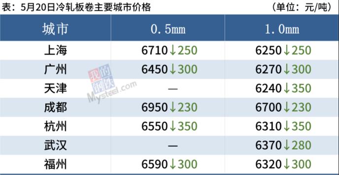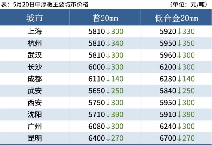 冷轧板卷:5月20日,全国24个主要城市1.0mm冷卷均价6455元/吨,较上个交易日下跌319元/吨。从基本面看,供应压力稍有缓解,部分钢厂产量环比小幅下降,受市场恐慌情绪影响,早盘大部分市场报价跌幅偏大,午后随着市场下跌后逐步企稳,部分市场报价反弹。钢厂方面,近几日接单价格下调后,贸易商锁单情况很差;需求方面,市场价格大幅下跌,终端观望情绪浓厚,零星采购为主。