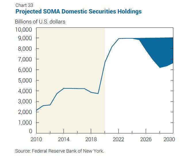 在这之后,随着FOMC货币政策立场正常化,该组合的演变路径将取决于政策选择。纽约联储在预测中提供了一系列可能的结果,SOMA组合规模可能稳定在9万亿美元,亦可能低至6.6万亿美元。