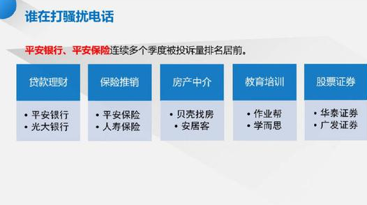 而平安银行及光大银行因多次拨打“贷款理财”相关电话被投诉而被点名,平安保险及人寿保险则因“保险推销”骚扰电话被通报。