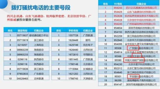 同时,拨打骚扰电话的主要号段投诉量企业排名显示,广发银行、民生银行、中国大地财险及平安银行都排在前20名以内。