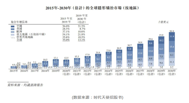 市场容量上,灼识咨询报告显示,中国作为全球第二大市场的整体隐形矫治市场,零售销售收入预期将由2019年的14亿美元增至2030年的119亿美元,复合年增长率达21.5%。