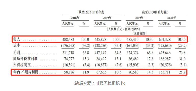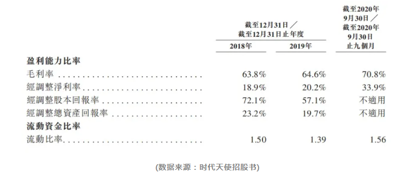 而比起快速的增长速度,令人瞩目的恐怕是它的毛利率水平。据招股书显示,2018年至2019年,该公司的毛利率分别为63.8%、64.6%,逐年提升;而经调整净利率期内则为18.9%、20.2%,亦不断提升。