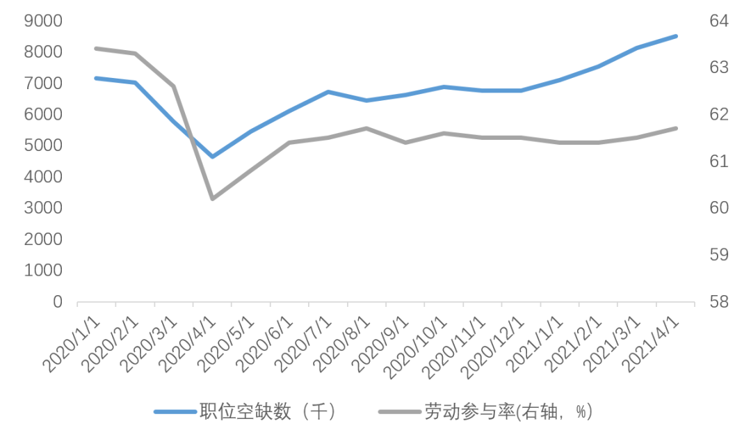 第三,劳动力市场的供求错配:4月非农就业弱于预期,但JOLTS数据显示的岗位需求数创历史新高,显示美国就业市场整体呈现供不应求的状况。感染疫情的担忧和不断的失业补助拖累就业市场的恢复。当前来看,一方面随着服务业的快速恢复,部分劳动力被重新吸引回就业市场,但随着新一轮失业救济于2021年3月底开始发放,美国就业市场供给的拖累仍然存在。