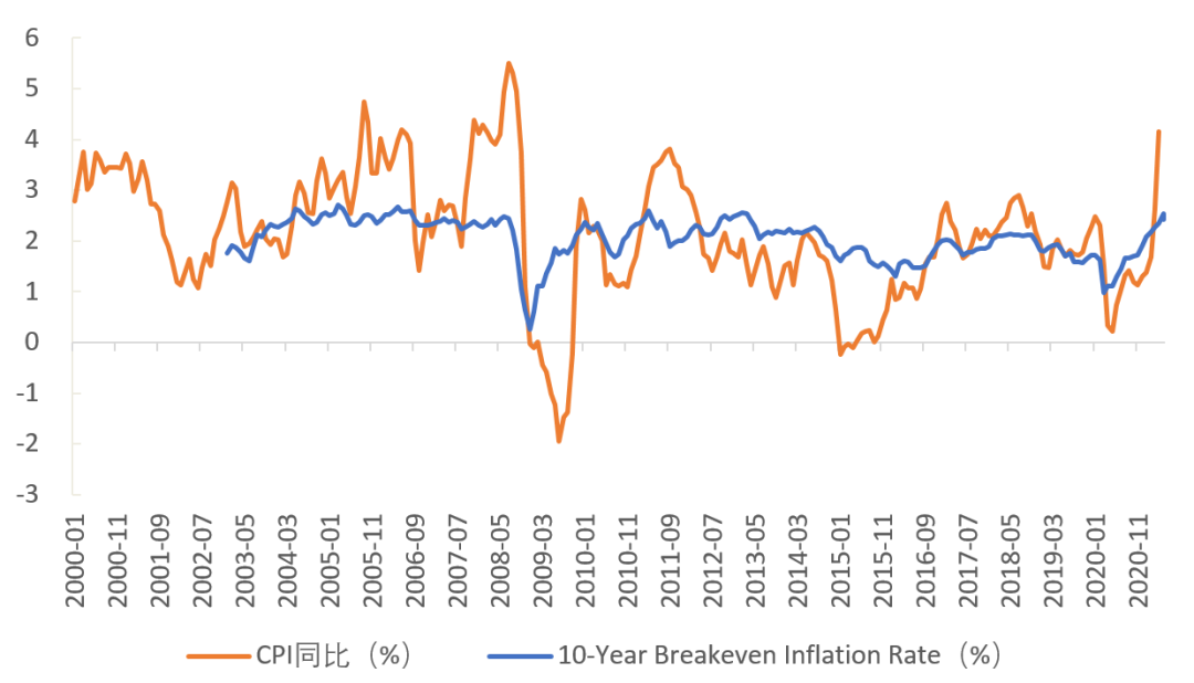 从当前市场对于通胀预期的定价来看:市场仍然认为通胀只是中短期的。TIPS盈亏平衡通胀率显示核心通胀水平短期远高于美联储目标,但长期与目标持平。