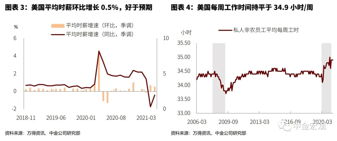 新增就业再次不及预期,凸显劳动力供给瓶颈。继4月新增就业大幅不及预期后,5月就业再度不及预期,说明就业复苏的道路并非坦途。分行业看,休闲住宿、教育医疗表现良好,反映外出活动增加、学校重启带来的提振。制造业较上月有所回暖,但建筑业、零售业表现不佳。我们此前指出,拖累就业复苏的原因不是企业需求不足,而是劳动力供给不足。最新公布的美联储褐皮书也显示,劳动力短缺在5月进一步加剧,越来越多的企业抱怨,招聘困难是当前面临的最大瓶颈。另外5月劳动参与率较上月下降,说明劳动者就业意愿是不足的。