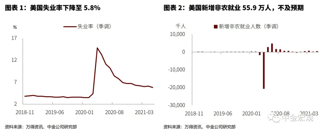 美国5月新增非农就业55.9万人,不及市场预期的67万人。失业率下降至5.8%,好于预期。劳动参与率为61.6%,较上月下降0.1个百分点,略显意外。小时工资环比增长0.5%,高于预期的0.2%,这也是工资环比增速连续第二个月超预期。