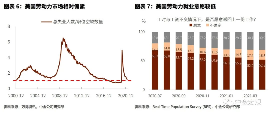 未来这些因素能否改善呢?我们认为,老年人提前退休更多是结构性的,恐怕很难在短期逆转。女性的就业意愿取决于学校复课的速度。5月公立和私人学校新增就业分别上升10.3万和4.1万人,说明学校在复课,这是一个积极的信号。另外近期多个州政府宣布将提前取消额外的失业补贴,这对提高劳动力供给也是有帮助的。不过,最终是否工作取决于劳动者自身的意愿。随着疫苗接种推进,夏天旅游旺季到来,不排除许多美国人会选择外出游玩消费,而不是尽快回归工作。