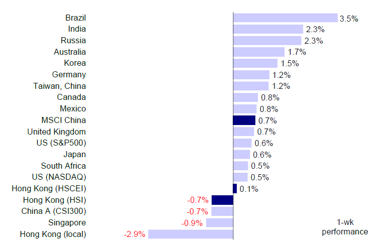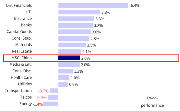 MSCI中国指数上周上涨0.7%,电信、可选消费和能源板块领涨