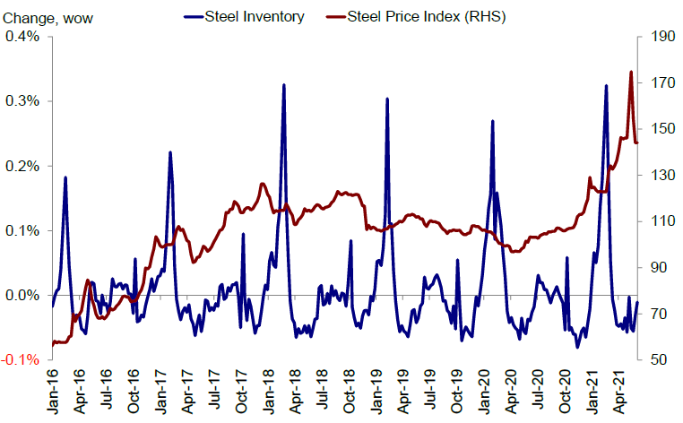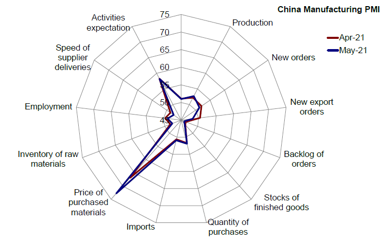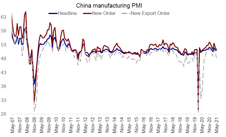 1)5月份PMI:制造业PMI下降,新出口订单指数降至收缩区间。具体来看,5月份官方制造业PMI下降0.1个百分点,至51,略低于预期。最为明显的是,新出口订单指数从4月份的50.4%降至48.3%,进入收缩区间。出口一直是中国经济复苏进程中的一大亮点,4月份同比大幅增长32%(过去两年年均复合增速17%)。新出口订单指数降幅之所以超出预期,可能是由于近期东南亚地区疫情反弹。但是中国出口是否正在丧失增长动力需要进一步确认。我们认为,在供应存在瓶颈、库存下降以及短期海外需求大幅增长背景下,中国出口可能持续向好。但是,3季度后中国出口大幅增长势头可能逐步减弱。