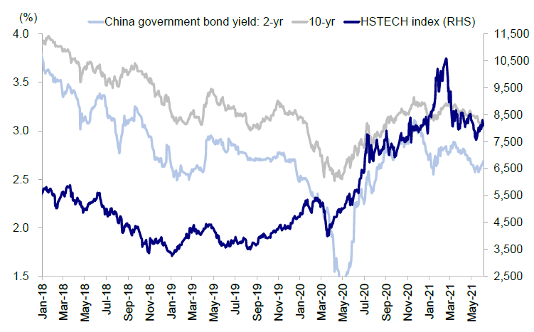 与4月份经济数据呈现的局面相似的是,上周最新公布的5月制造业PMI(51.0%,低于4月份的51.1%)可能也表明需求增长动能似乎正在衰减,尤其是新出口订单指数回落较为明显。具体来看,5月份新出口订单指数大幅下降约两个百分点,从4月份的50.4%降至48.3%,进入收缩区间。虽然仅凭一个月数据就断定中国出口增长动能趋缓仍然为时尚早,但是考虑到出口疫情以来一直是中国经济复苏过程中的一大亮点,因此短期新出口订单指数大幅下降的确引发了关注。不仅如此,我们注意到近期钢铁和水泥等部分工业品价格也出现回调,这在一定程度上有助于缓解近期的通胀忧虑,债券收益率也因此而继续承压,进而利好市场成长风格的表现,相反价值和周期板块则相对承压。此外,海外中资股市场成长板块(以恒生科技指数为例,PEG为1倍)与A股和海外市场(创业板1.68倍,纳斯达克1.56倍)相比仍然具有吸引力。因此,我们认为在当前的宏观政策环境以及估值角度看,成长风格依然具备一定吸引力。