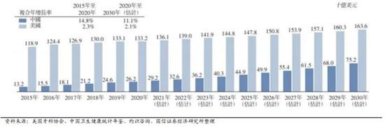 2015-2030 年美国和中国的牙科护理服务市场规模(单位:十亿美元)