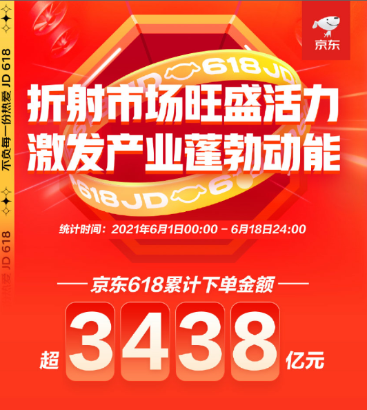 京东的618最终战报于昨日发布:2021年6月1日0时至6月18日24时,2021“京东618,18周年庆”累计下单金额超3438亿元,创下新的纪录。而2020年京东618全球年中购物节(6月1日0时至6月18日24时)这一数字记录为2692亿元,2021年较前一年增长幅度为27.71%。
