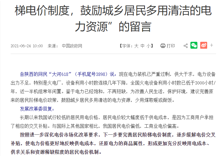 6月24日,中国政府网发布,发展改革委答网民关于“建议完善居民阶梯电价制度,鼓励城乡居民多用清洁的电力资源”的留言。