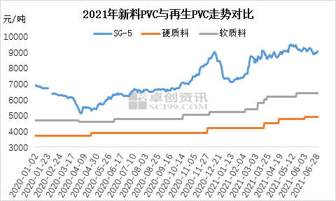 春节后,包含PVC在内的许多化工、塑料等原材料在春节后涨势迅速。从图2中可以看出,新料PVC在2021年上半年价格远高于往年同期,以华东地区为例,1月初至6月29日,华东SG-5均价8560元/吨,较去年同期高2502元/吨,较去年全年高1919元/吨。