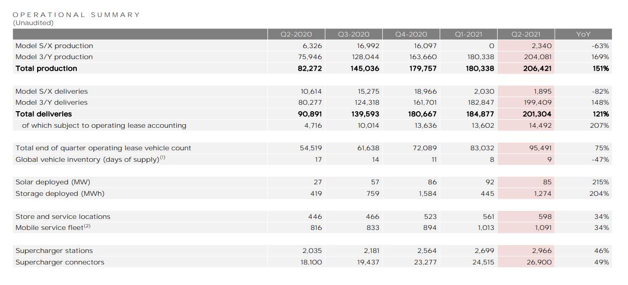 如此惊人的增长,主要得益于飙升的汽车产量和交付量。公司第二季度生产了20.6万辆电动汽车,同比增长151%,其中Model 3和Model Y总计占了20.4万辆,同比增长169%;第二季度共交付了20.1万辆,同比增长121%,其中Model 3和Model Y总计占了19.9万辆,同比增长148%。