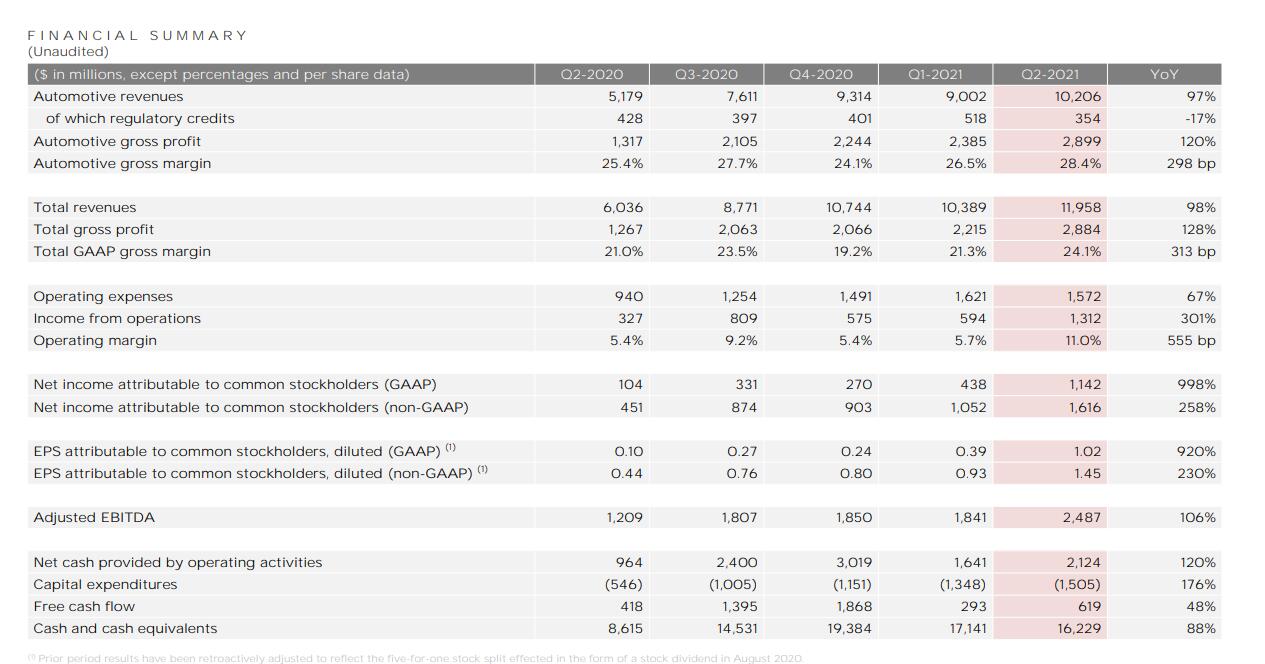 财报数据显示,特斯拉二季度总营收119.6亿美元,创有史以来新高,高于预期的113亿美元和去年同期的60.4亿美元,同比增长98%。其中汽车部门总收入为102.1亿美元,历史首次超过100亿美元大关,去年同期为51.8亿美元;汽车毛利率为28.4%,高于过去四个季度的任何一个季度。