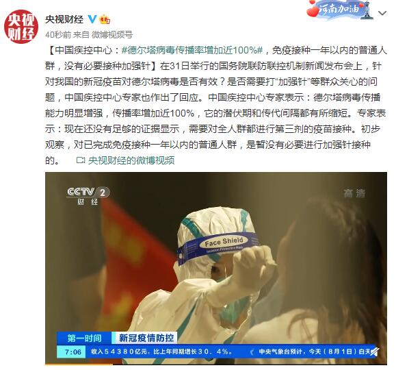 中国疾控中心:德尔塔病毒传播率增加近100%,免疫接种一年以内的普通人群,没有必要接种加强针