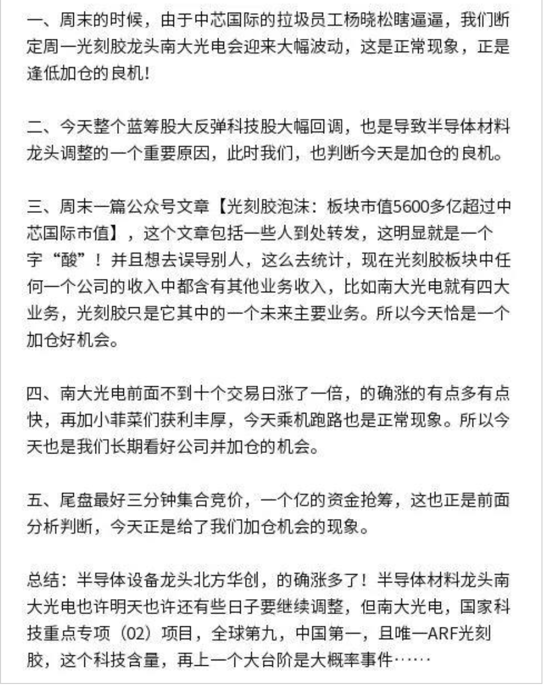 而且我认为这两天半导体股价的大跌,未必不是一件好事。周末出了“你算老几”事件,昨天盘后各圈子里流传的一段“半导体材料龙头南大光电盘后感谢”文字继续挑起事端。具体内容如下: