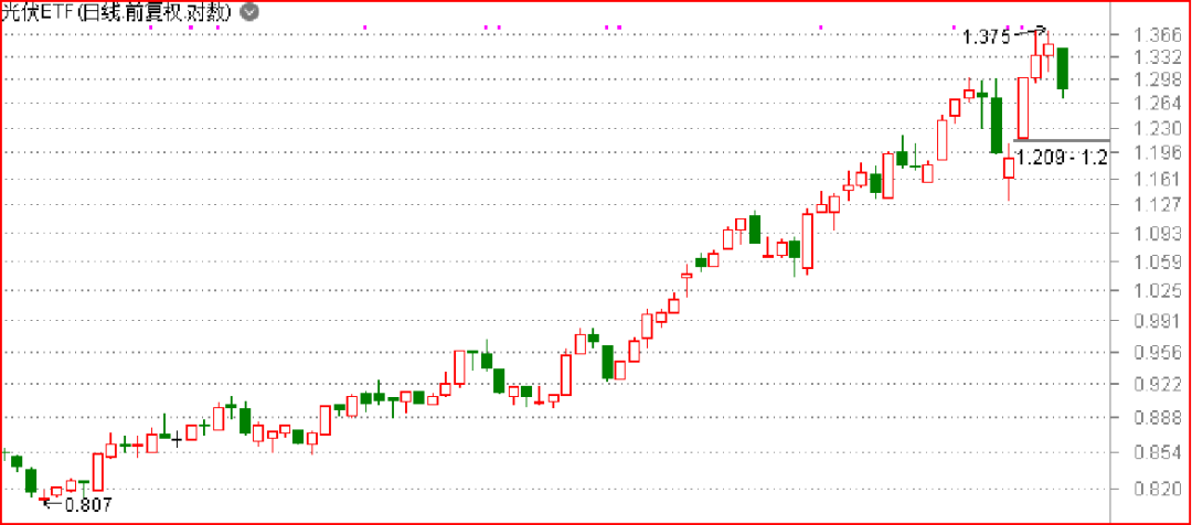 这两天股价的下跌,更多是涨多后的自然调整。以光伏ETF为例,即使今天出现大跌,但是丝毫不改往上的趋势。