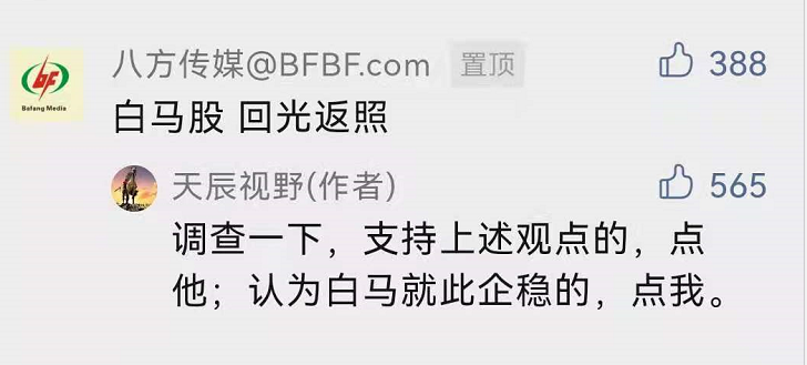 下图是昨天文末的调查,可以看出力挺白马股的比例还是明显占优。
