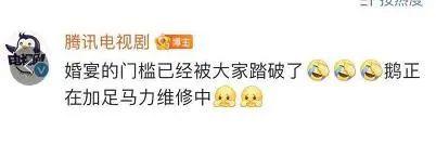 腾讯电视剧微博表示:“婚宴的门槛已经被大家踏破了,鹅正在加足马力维修中。”