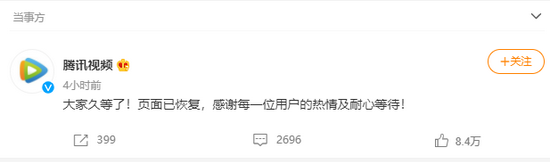 晚上9点20分,腾讯视频在微博上表示,页面已恢复。