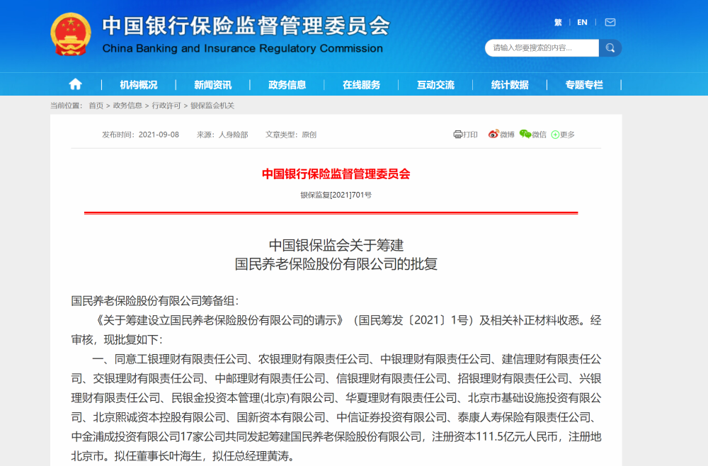 中国银保监会批复筹建国民养老保险股份有限公司,注册资本111.5亿元人民币,注册地北京市。拟任董事长叶海生,拟任总经理黄涛。