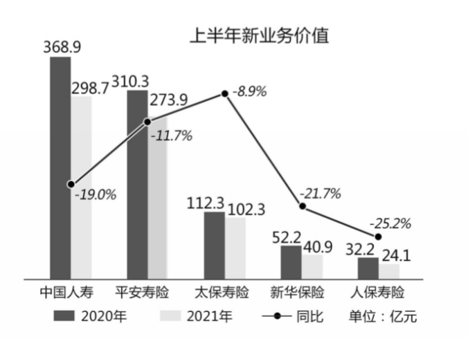 在衡量一家保险公司业务品质优劣的关键指标——新业务价值上,五家上市险企无一例外出现大幅度的下滑。上半年,中国人寿新业务价值为298.67亿元,同比下降19.0%;平安寿险为273.87亿元,同比下降11.7%;太保寿险为102.31亿元,同比下降8.9%;新华保险为40.90亿元,同比下降21.7%;人保寿险为24.12亿元,同比下降25.2%。