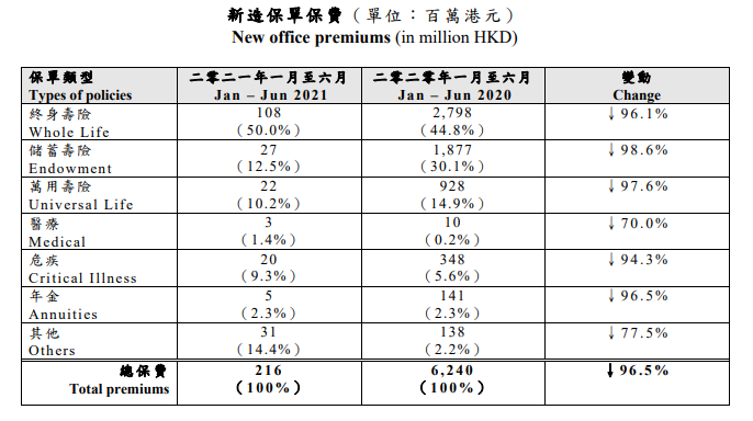 据统计,来自内地访客的新单保费从2020年上半年的62亿港元收缩至2021年同期的约2亿港元,同比骤减96.5%,创新低。