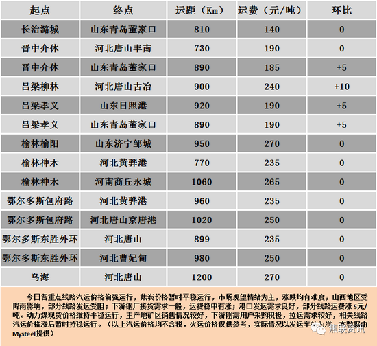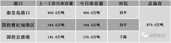 秦皇岛港铁路调入45.0万吨,装船45.0万吨,场存400.0万吨,锚地煤炭船舶49艘,预到19艘;国投曹妃甸港铁路调入19.3万吨,装船19.3万吨,场存344.0万吨,锚地煤炭船舶33艘,预到6艘;国投京唐港铁路调入7.6万吨,装船13.6万吨,场存135.0万吨,锚地煤炭船舶9艘,预到0艘。
