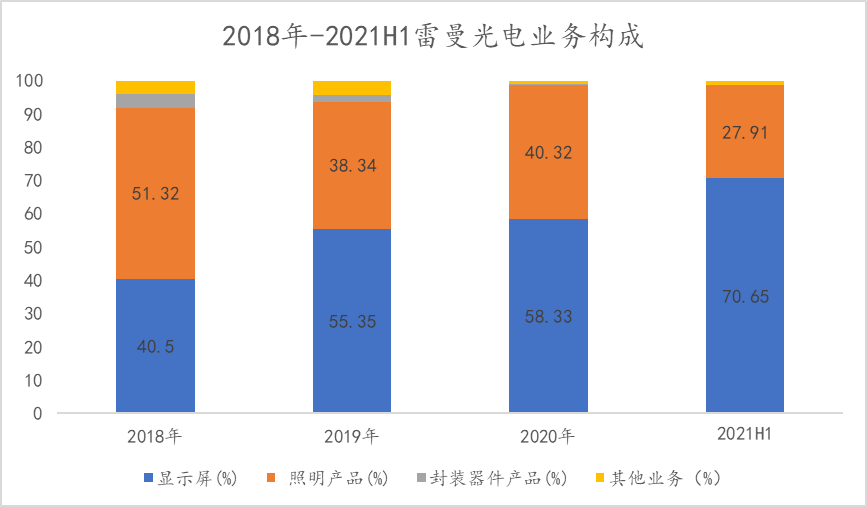 从产品分布上看,2021年上半年,雷曼光电显示屏业务实现营收4.01亿元,同比增长48.3%,营收占比为70.65%,同比增长14.92个百分点,并且呈现出不断上升趋势;照明产品实现营收1.58亿元,同比下降7.1%,营收占比为27.91%,同比下降12.41个百分点。