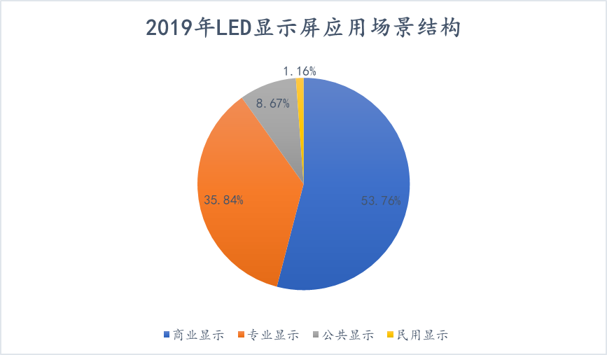 首先,从LED显示屏的需求结构来看,专业显示屏(安防、交通、能源等行业)、商业显示(体育馆、零售、会议室、电影院等领域)、公共显示和民用显示的占比分别为35.84%、53.76%、8.67%和1.16%,专业显示和商业显示是LED显示屏下游的主要应用。