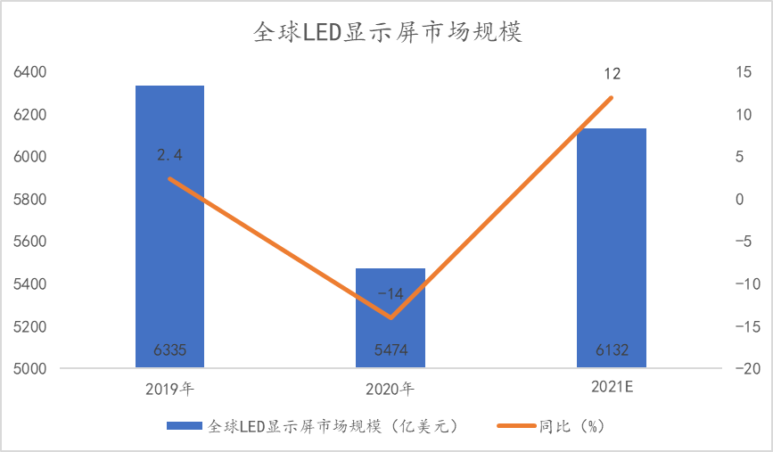 根据 TrendForce 数据显示,2020 年全球LED屏显示屏市场规模较2019年下降14%,而随着疫情缓解,2021年市场空间预计会增长12%至61.32亿美元。