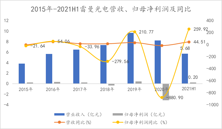 图2:2015年-2021H1雷曼光电营收、归母净利润及同比
