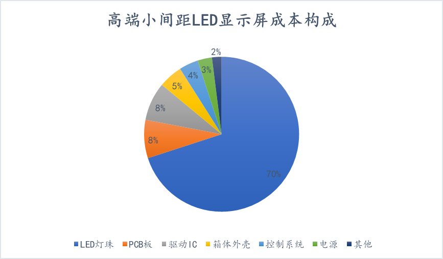 第二个方面,从供给端来看,高端小间距LED显示屏的构成主要分为LED灯珠/芯片、PCB板、驱动IC、箱体外壳、控制系统、电源等部分,其成本占比分别约为70%、8%、8%、5%、4%和3%。