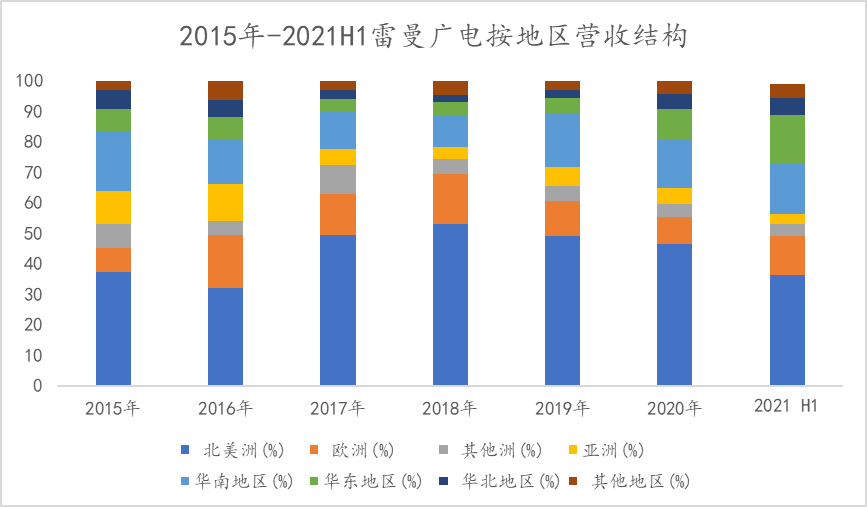 图4:2015年-2021H1雷曼广电按地区营收结构