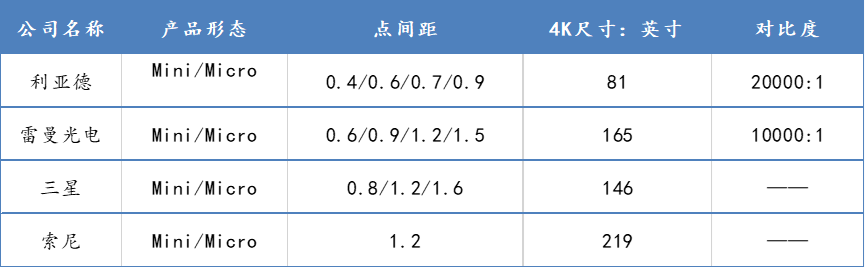 与行业竞争对手相比,雷曼光电基于COB技术的Mini/Micro LED显示屏产品在技术上与三星、索尼等厂商较为接近。在点间距上,公司已经成功研发并量产P0.6产品,并处于行业领先地位。