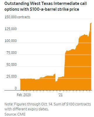 根据芝加哥商品交易所集团(CME Group)的数据,10月份平均每天有16.7万份WTI期权成交,为2020年3月以来最多。QuikStrike的统计则显示,执行价100美元的看涨期权是目前在WTI原油市场上持有最广泛的期权。交易员们指出,这种情况很不寻常,因为这些执行价位远远超出了目前的油价波动水平。