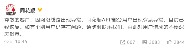 针对同花顺崩了,同花顺发布微博回应称:“因网络线路出现异常,同花顺APP部分用户出现登录异常,目前已经恢复。如有个别用户仍存在问题,请随时联系我们。由此对用户造成的不便深表歉意。”