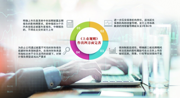 相比征求意见稿,《上市规则》作出了四方面完善:明确上市负面清单中未按期披露定期报告的影响期要求,即申报前36个月内未按规定披露年度报告、中期报告的,不得在北交所发行上市;进一步压实保荐机构责任,适当延长保荐机构持续督导期,发行上市和再融资的持续督导期延长至3年和2年;保持制度延续性,明确新三板挂牌期间依法实施的股权激励可在北交所上市后继续实施,限售、行权等安排保持不变;为防止公司通过披露不可信的财务报告规避财务类强制退市,在保持财务类退市指标总体不交叉适用的前提下,对审计报告类型适当从严要求。