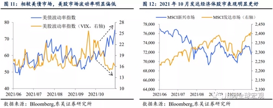 股市方面,发达经济体依旧淡定,新兴市场感受到“滞胀”的压力。与债市相比,股市明显更加淡定,尤其是发达经济体(图11),通胀升温和紧缩风险并未阻碍10月美股继续刷新历史高位。不过新兴市场股市表现相对不佳,货币政策收紧和中国经济动能放缓带来的压力开始显现(图12)。
