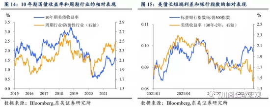 权益市场:对于发达经济体而言,现在尚难言拐点,长端利率上涨利多周期性行业,长短端利差走阔则可能利好银行等金融板块(图14和15)。对于科技类成长股来说,关注10年美债实际利率的变化,重要的时间窗口可能是12月美联储议息会议调整点阵图。而“滞胀”风险可能继续施压新兴市场权益市场的相对表现。