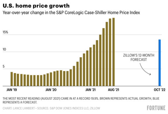 如此火爆的销售,已经连续数月超过了市场预期。美国知名线上房地产公司Zillow最新发布的报告预测,从2021年10月至明年1月的三个月内,美国房价将继续增长3.8%,到2021年底,美国整体房价将比2020年底上涨19.5%;预计2021年美国房屋销售量将达到612万套,较2020年增长8.5%。